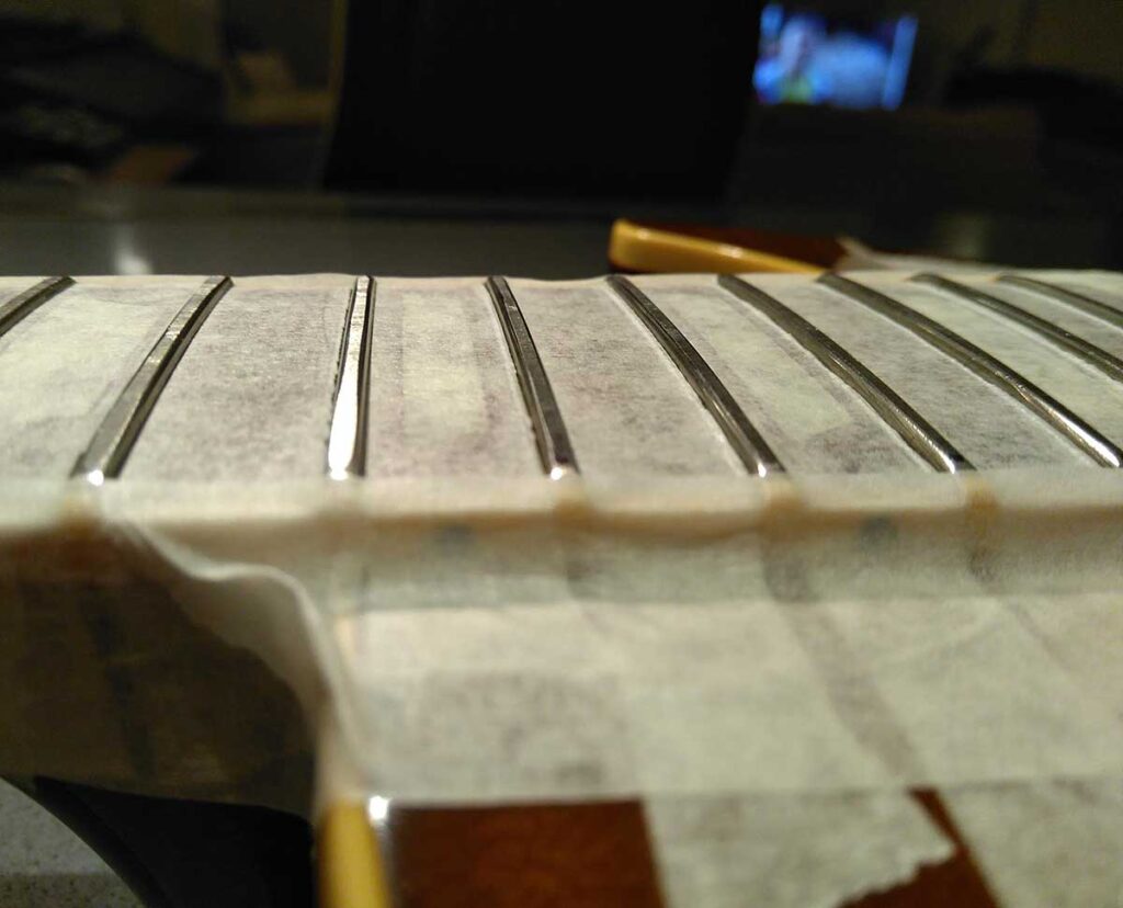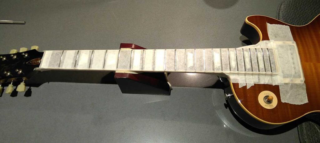 (Images above: Gibson Les Paul, frets levelled, ready for crowning and polishing.)